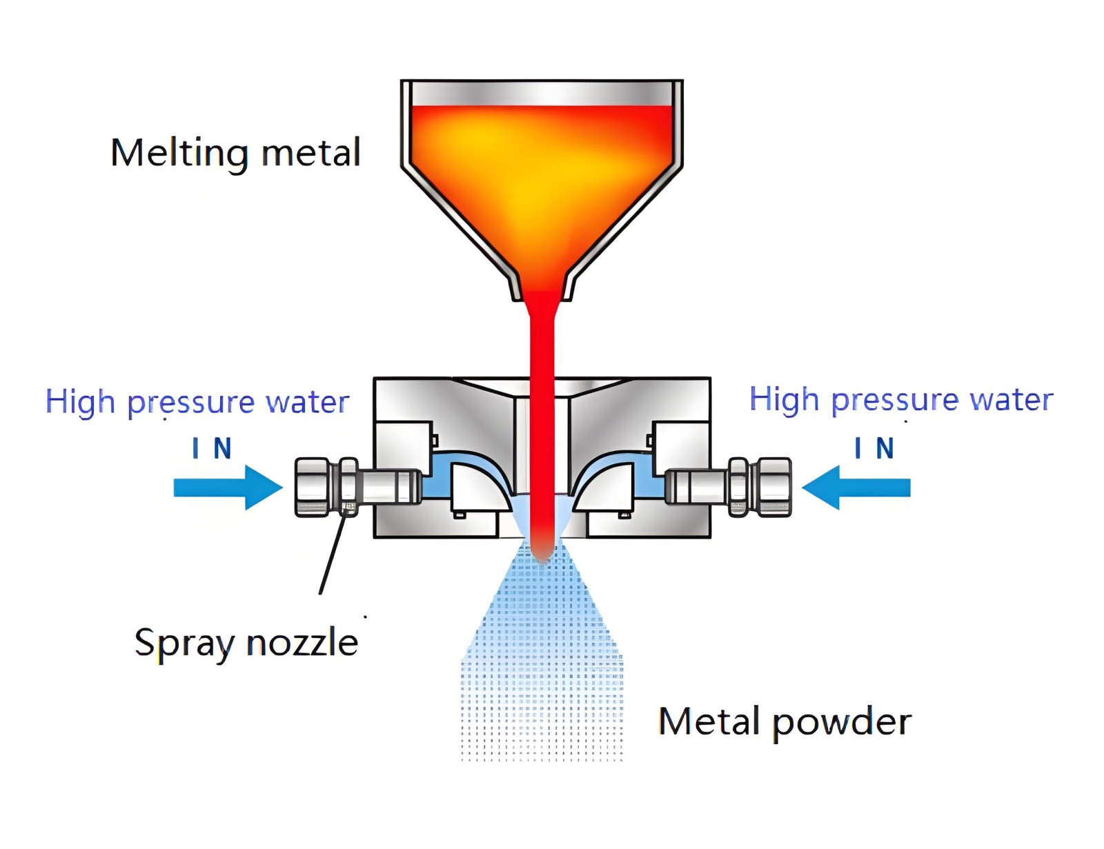 水霧化是以水為霧化介質(zhì)制備金屬粉末,通過高壓水流(20-100MPa)破碎金屬熔液,快速冷卻形成不規(guī)則粉末。其生產(chǎn)成本低,霧化效率高,常用來生產(chǎn)鋼鐵粉末、含油軸承用預(yù)合金粉末、鎳基磁性材料粉末等。相對(duì)氣霧化,水的比熱容比較大,在霧化過程中破碎的金屬熔滴快速凝固變成不規(guī)則狀,導(dǎo)致粉體形狀難以控制,且難以滿足金屬3D打印對(duì)粉末球形度的要求,需額外球化處理工序;此外由于活性金屬及其合金在高溫下與霧化介質(zhì)水接觸后會(huì)發(fā)生反應(yīng),增加粉末氧含量,這些問題限制了水霧化法制備球形度高、氧含量低的金屬粉末。