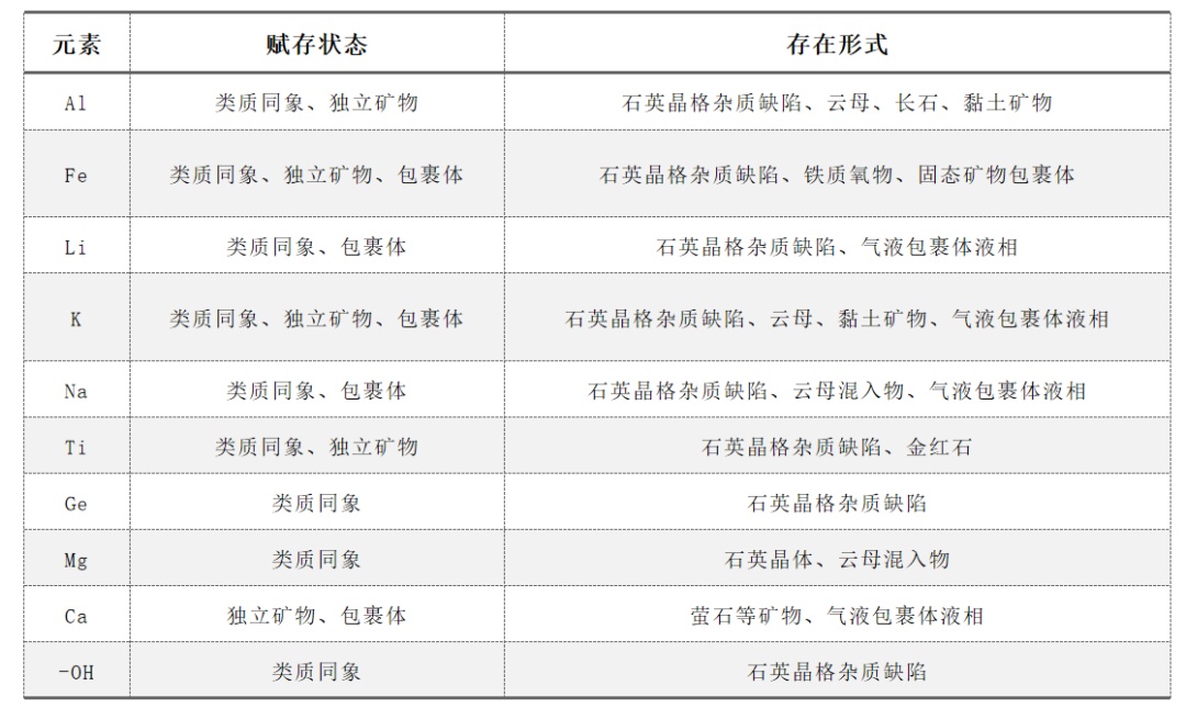 石英晶體在形成過程中,一些元素會(huì)替代硅元素進(jìn)入石英晶體中,形成了石英的結(jié)構(gòu)性雜質(zhì)。石英中常見的晶格雜質(zhì)元素有Al、Ti、Li、Na、K、Ge、OH等,從石英中分離難度大,是制約高純石英質(zhì)量最關(guān)鍵性因素。在現(xiàn)有加工技術(shù)下,石英原料中晶格雜質(zhì)幾乎不能被除去。