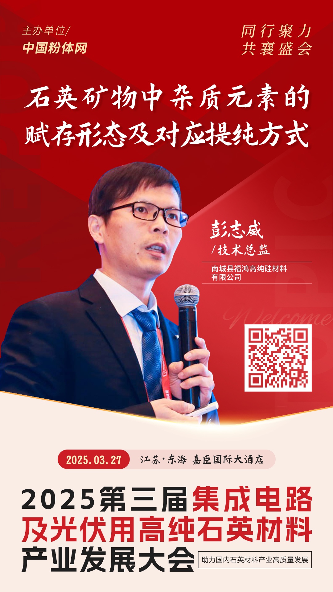 2025年3月27日,由中國粉體網(wǎng)主辦的“2025第三屆集成電路及光伏用高純石英材料產(chǎn)業(yè)發(fā)展大會(huì)”將在江蘇東海召開,屆時(shí)來自南城縣福鴻高純硅材料有限公司的技術(shù)總監(jiān)彭志威,將做題為《石英礦物中雜質(zhì)元素的賦存形態(tài)及對(duì)應(yīng)提純方式》的報(bào)告,屆時(shí),他將對(duì)石英礦物中雜質(zhì)元素的賦存形態(tài)以及對(duì)應(yīng)提純方式進(jìn)行詳盡講解。