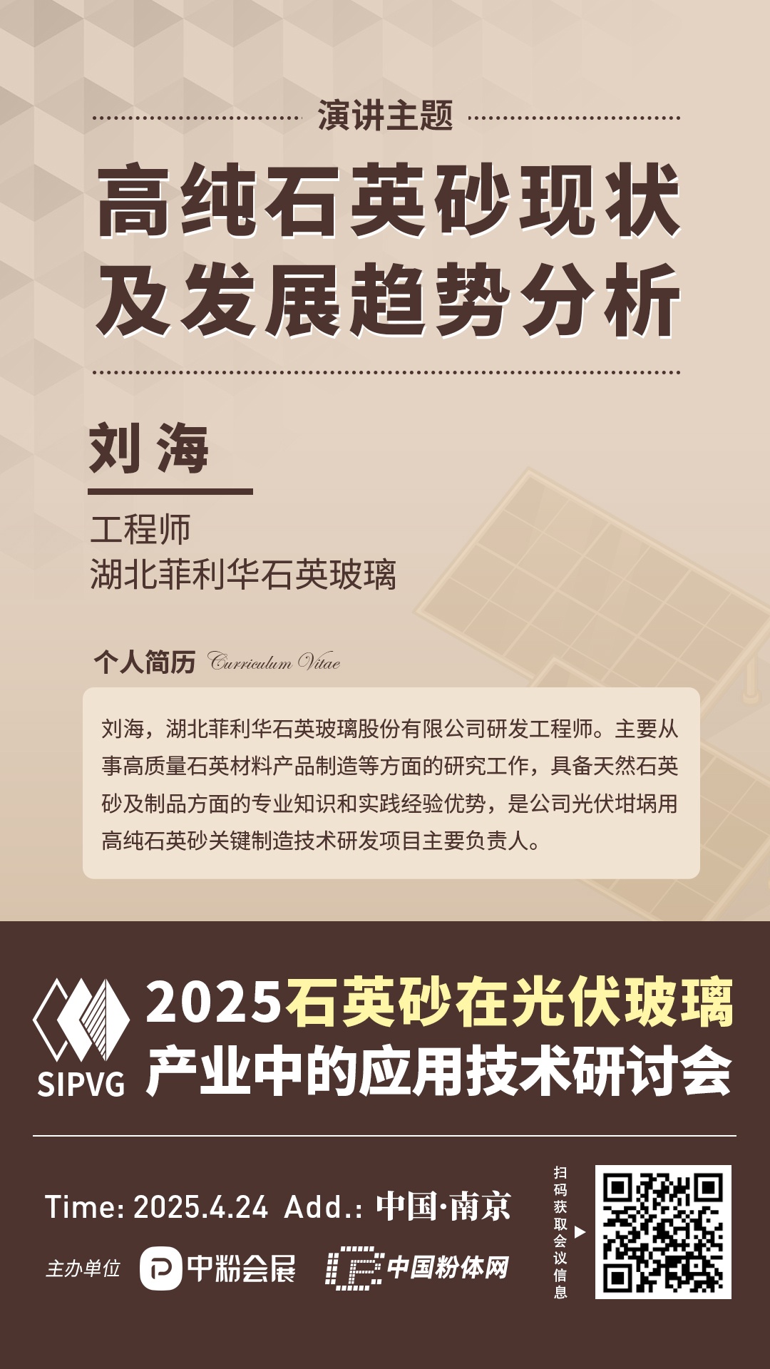 2025年4月24日,由中國粉體網、中粉會展主辦的“2025石英砂在光伏玻璃產業中的應用技術研討會”將在江蘇南京召開,屆時來自湖北菲利華石英玻璃股份有限公司的工程師劉海,將做題為《高純石英砂現狀及發展趨勢分析》的報告,報告將從制備工藝、市場現狀、競爭格局、發展前景及未來趨勢等方面對天然和合成石英砂進行匯報。