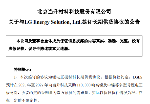 中國粉體網(wǎng)訊 近日,當升科技發(fā)布公告,宣布公司及其子公司江蘇當升材料科技有限公司、當升科技(常州)新材料有限公司、當升科技(芬蘭)新材料有限公司與LG Energy Solution, Ltd.(以下簡稱“LGES”)在韓國首爾正式簽訂了《LONG TERM SUPPLY AGREEMENT》(長期供應協(xié)議)。