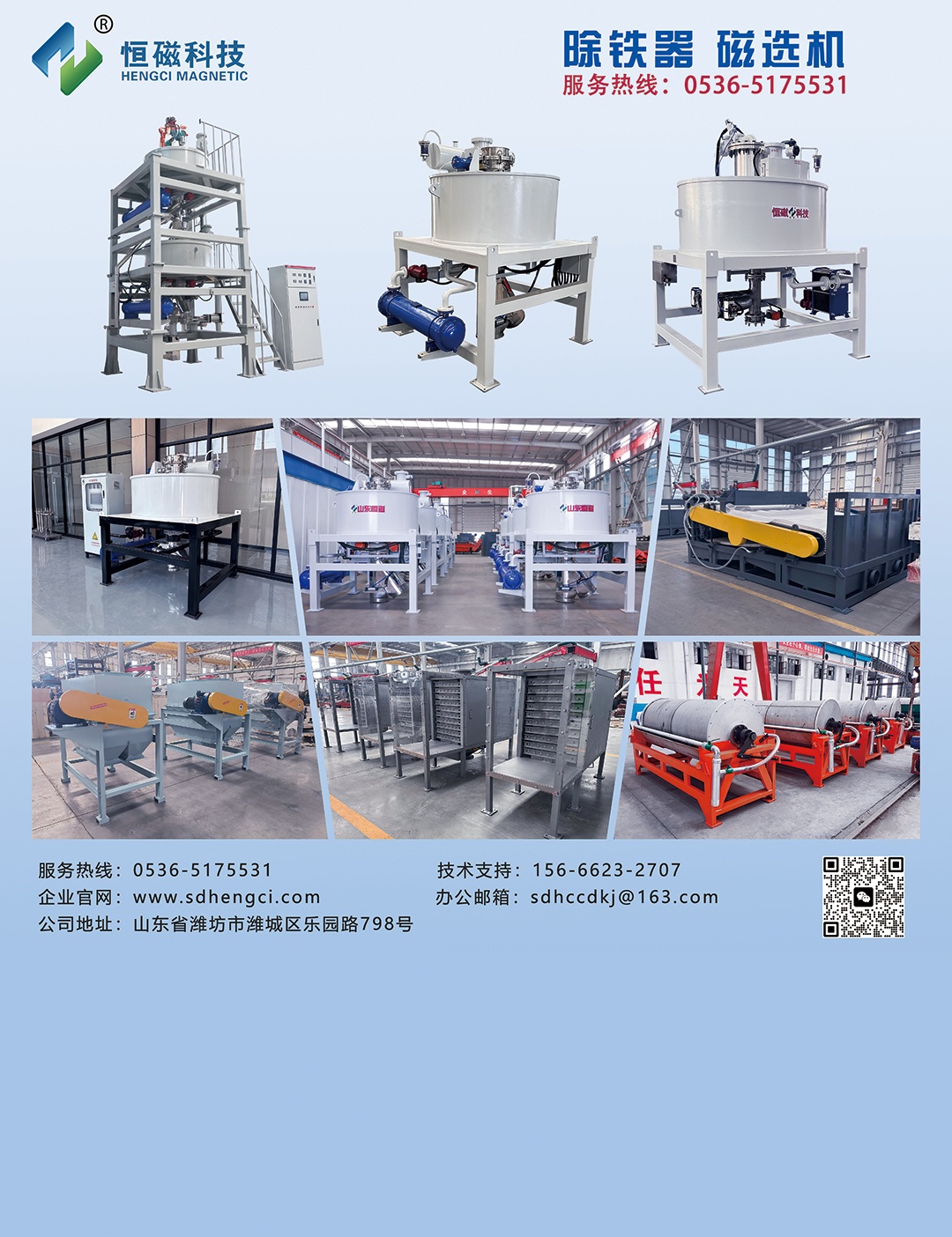 山東恒磁科技有限公司是國內較早從事磁選除鐵設備研發生產的磁選機廠家,公司主營產品:磁選機、干式磁選機、濕式磁選機、小型磁選機、高梯度磁選機、筒式磁選機、高嶺土磁選機、石英砂磁選機、鉀長石磁選機、非金屬磁選機、金屬磁選機以及單傳動高壓輥磨機等,公司擁有高品質的技術人才和磁選研究技術專家,公司秉承現代企業的科學管理模式、精工制造、銳意進取、開拓創新,是一家現代化的綜合科研開發、生產制造、調試服務為一體的公司,山東恒磁重工始終向客戶提供品質優良的產品和快捷完善的服務。
