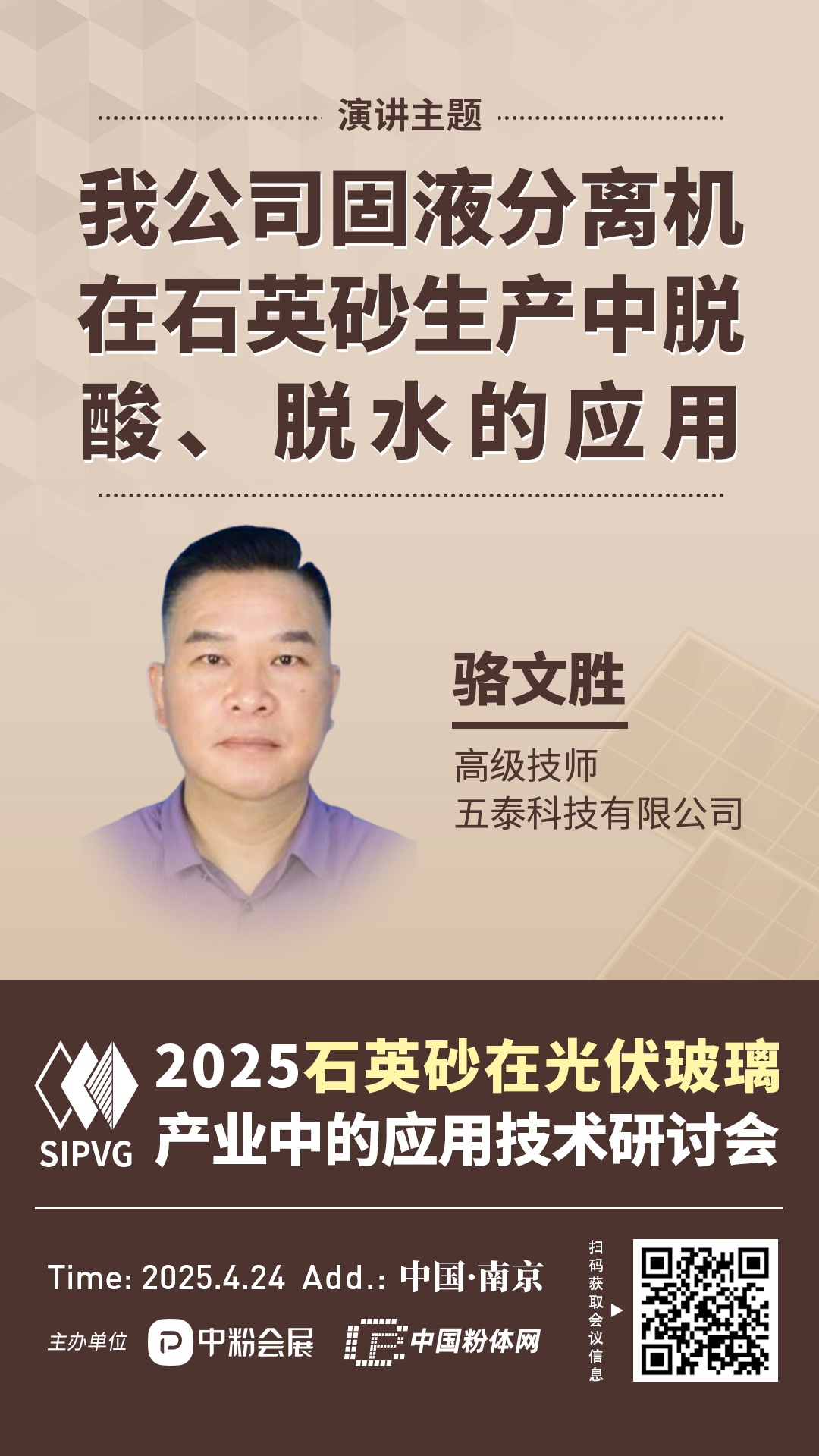2025年4月24日,由中國粉體網(wǎng)、中粉會展主辦的“2025石英砂在光伏玻璃產(chǎn)業(yè)中的應(yīng)用技術(shù)研討會”將在江蘇南京召開,屆時來自廣西柳州五泰科技有限公司的駱文勝高級技師,將做題為《五泰科技固液分離機(jī)在石英砂生產(chǎn)中脫酸、脫水的應(yīng)用》的報告。