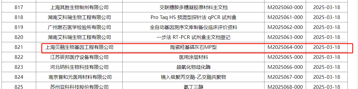 中國粉體網訊 3月18日,貝融生物生產的陶瓷羥基磷灰石MP型的醫療器械主文檔備案,登記編號:M2025064-000。