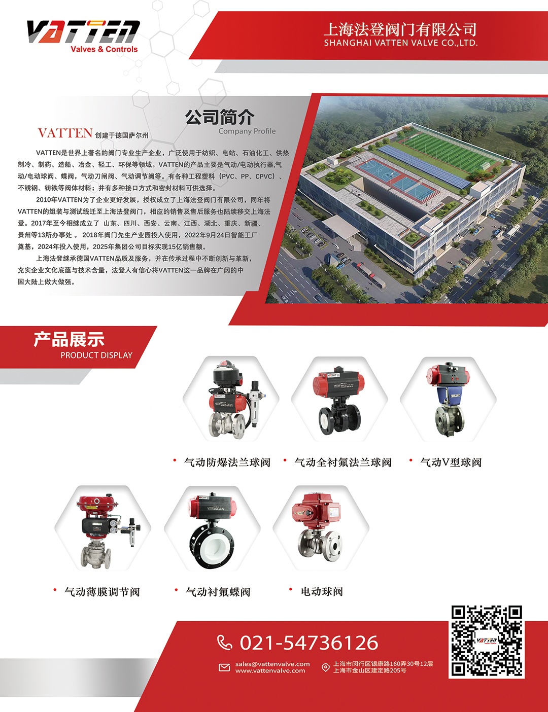 VATTEN創建于德國薩爾州。VATTEN是世界上著名的閥門專業生產企業,廣泛用于紡織、電站、石油化工、供熱制冷、制藥、造船、冶金、輕工、環保等領域。VATTEN的產品主要是氣動,電動執行器、氣動/電動球閥、蝶閥、氣動刀閘閥、氣動調節閥等。有各種工程塑料(PVC,PP , CPVC),不銹鋼、鑄鐵等閥體材料;并有多種接口方式和密封材料可供選擇。