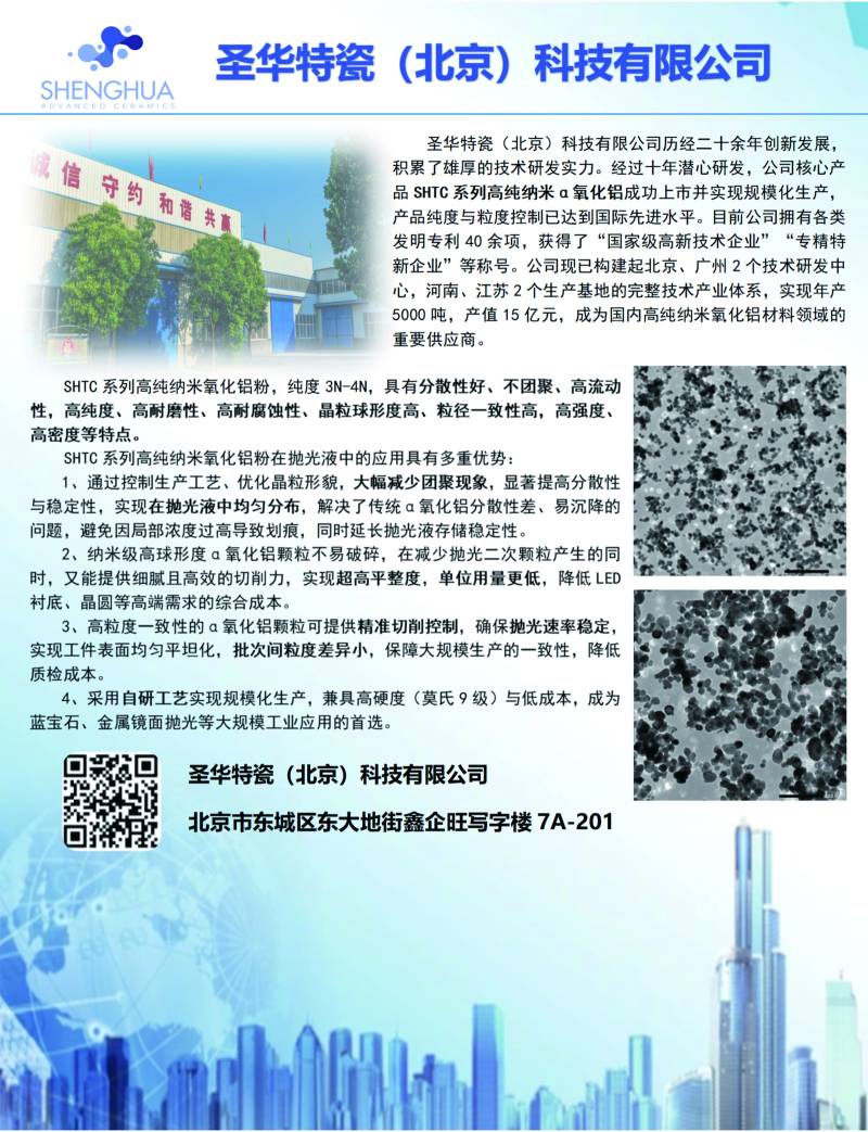 目前,圣華特瓷已實現年產各類高純度納米級a-氧化鋁粉體產品超300噸,建設研發中心1個,生產基地2個。公司產品已應用于半導體CMP拋光、陶瓷靜電卡盤制造、陶瓷電子基板制造、復合材料制造等領域,產品品質獲得國內多家相關領域龍頭企業與科研機構認可。