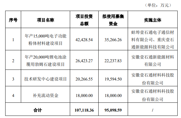 2022年,壹石通募集資金總額不超過95,098.59萬元用于年產(chǎn)15,000噸電子功能粉體材料建設(shè)項目、年產(chǎn)20,000噸鋰電池涂覆用勃姆石建設(shè)項目、技術(shù)研發(fā)中心建設(shè)項目以及補充流動資金項目。