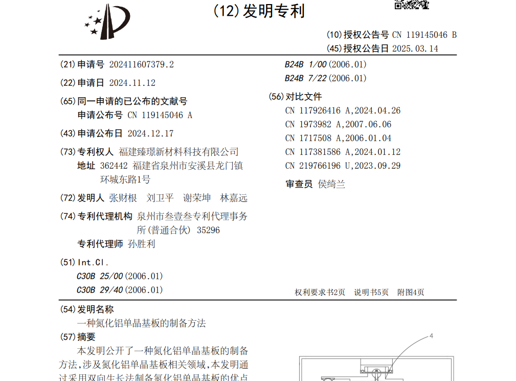 中國粉體網(wǎng)訊 近日,國家知識產(chǎn)權(quán)局信息顯示,福建臻璟新材料科技有限公司取得一項名為“一種氮化鋁單晶基板的制備方法”的專利,授權(quán)公告號CN119145046B,申請日期為2024年11月。