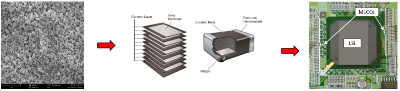 縱覽整條MLCC產業鏈,上游為原材料制造環節,包含兩類主要原材料,一類是陶瓷粉料,陶瓷粉料主要原料是鈦酸鋇、氧化鈦、鈦酸鎂等。