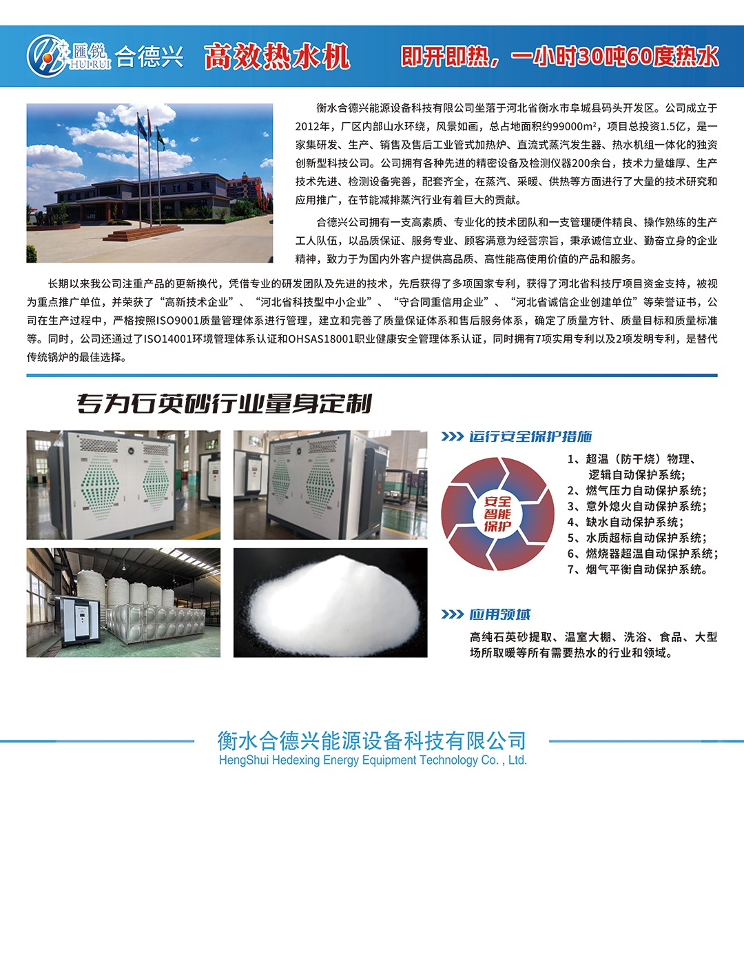 衡水合德興能源設備科技有限公司由東光縣盛沃節能設備有限公司和東光縣華立石化機械廠投資興建,公司位于衡水市碼頭開發區,是一家集研發、生產、銷售工業管式加熱爐及蒸汽發生器一體化的合資創新型科技公司。公司主要經營產品:全預混冷凝蒸汽發生器、低氮蒸汽熱源機,低氮熱水機、石油化工管式加熱爐等。具有完善的冷熱換熱技術和水汽分離系統,采用平板式全預混陶瓷燃燒器,逆向燃燒等先進技術,具有安全、節能的優勢特性。公司本著以客戶三個滿意為基本原則“質量的滿意、先進技術的滿意、服務的滿意”,不斷加強企業內部的綜合競爭力,公司在競爭中求發展,在挑戰中謀機遇,相信公司會給您提供高端、先進的蒸汽設備。