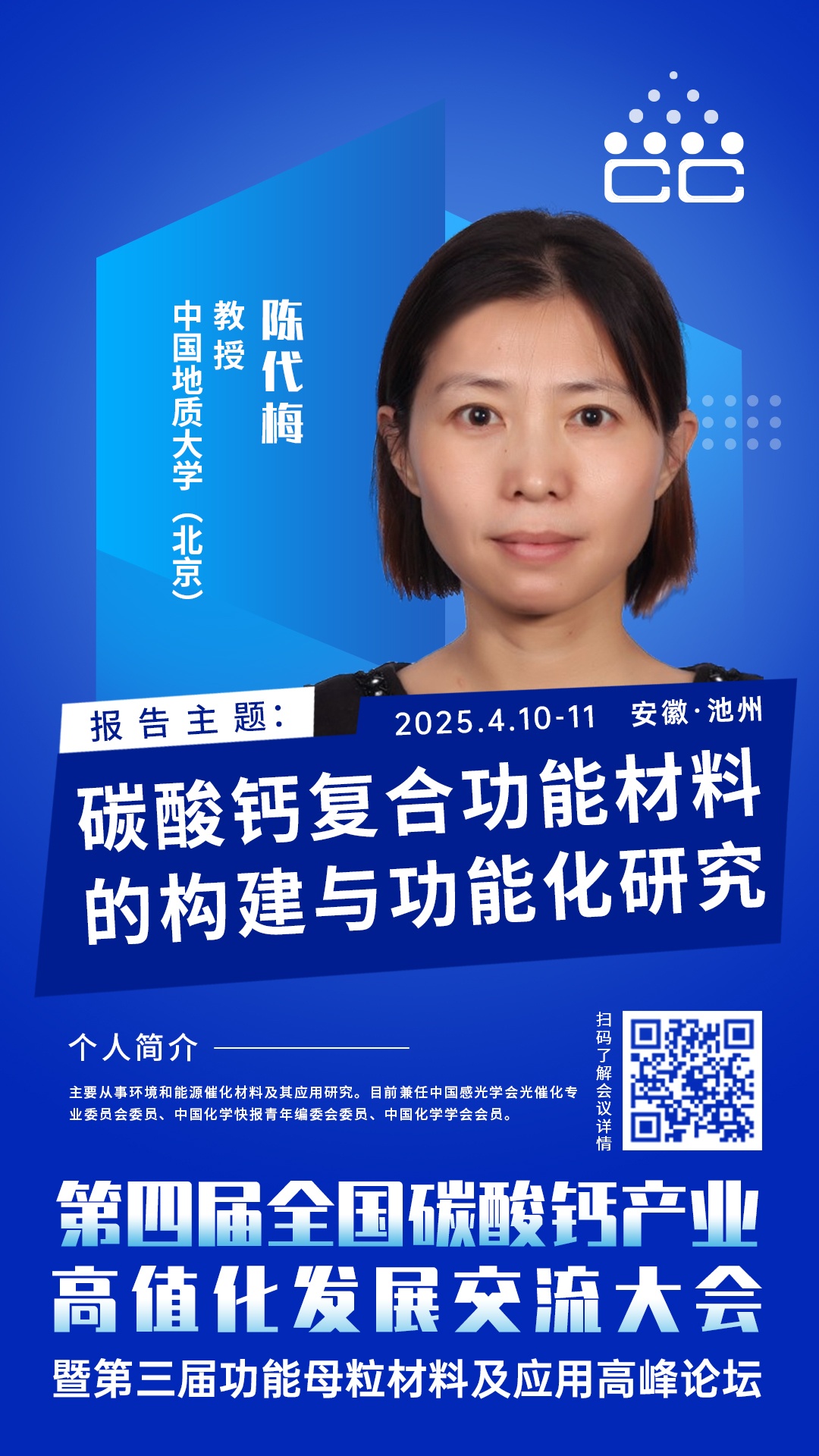 2025年4月10-11日,由中國粉體網主辦的第四屆全國碳酸鈣產業高值化發展交流大會將在安徽·池州舉行,屆時中國地質大學(北京)陳代梅教授將在大會上作《碳酸鈣復合功能材料的構建與功能化研究》主題報告,介紹采用碳酸化法制備CaCO3@SiO2的全流程技術工藝及其性能和應用前景。
