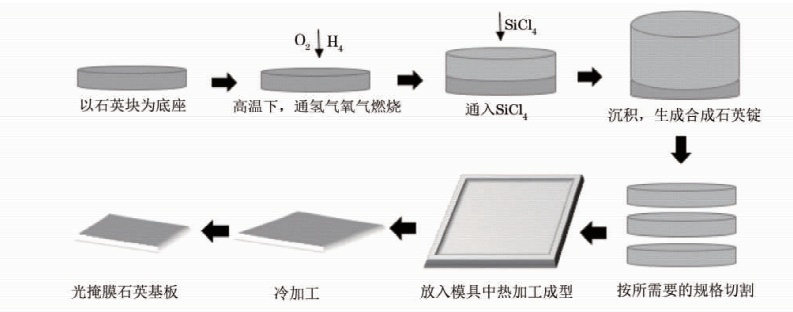 以化學(xué)氣相沉積法(CVD)為例,合成石英的制造是以SiCl4作為原料,在氫氧焰中高溫水解或氧化生成SiO2微粒,沉積熔化形成透明的高純石英錠。根據(jù)光掩模石英玻璃基板的規(guī)格將石英錠割成相應(yīng)尺寸的石英塊,通過熱加工方式形成石英板。經(jīng)過一系列的冷加工如切割、開方、倒角、磨拋等工藝的石英板最終形成光掩模石英玻璃基板。