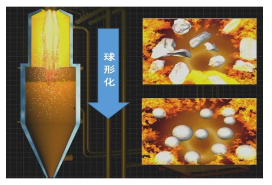 以角形硅微粉為原料,對其進行粉碎、篩分、提純等前處理,即將角形硅微粉通過氣流破碎機破碎,經過多級預處理后,篩分到合適粒徑;采用乙炔、天然氣等氣體作為熔融粉體的熱源,其火焰潔凈無污染,將合適粒徑的角形硅微粉采用高溫火焰熔融法將其高溫瞬間熔化,并快速冷卻球化成形,得到高純度且粒徑均勻的球形硅微粉。目前國內主流廠商制備的球形硅微粉主要原理為火焰熔融制備。