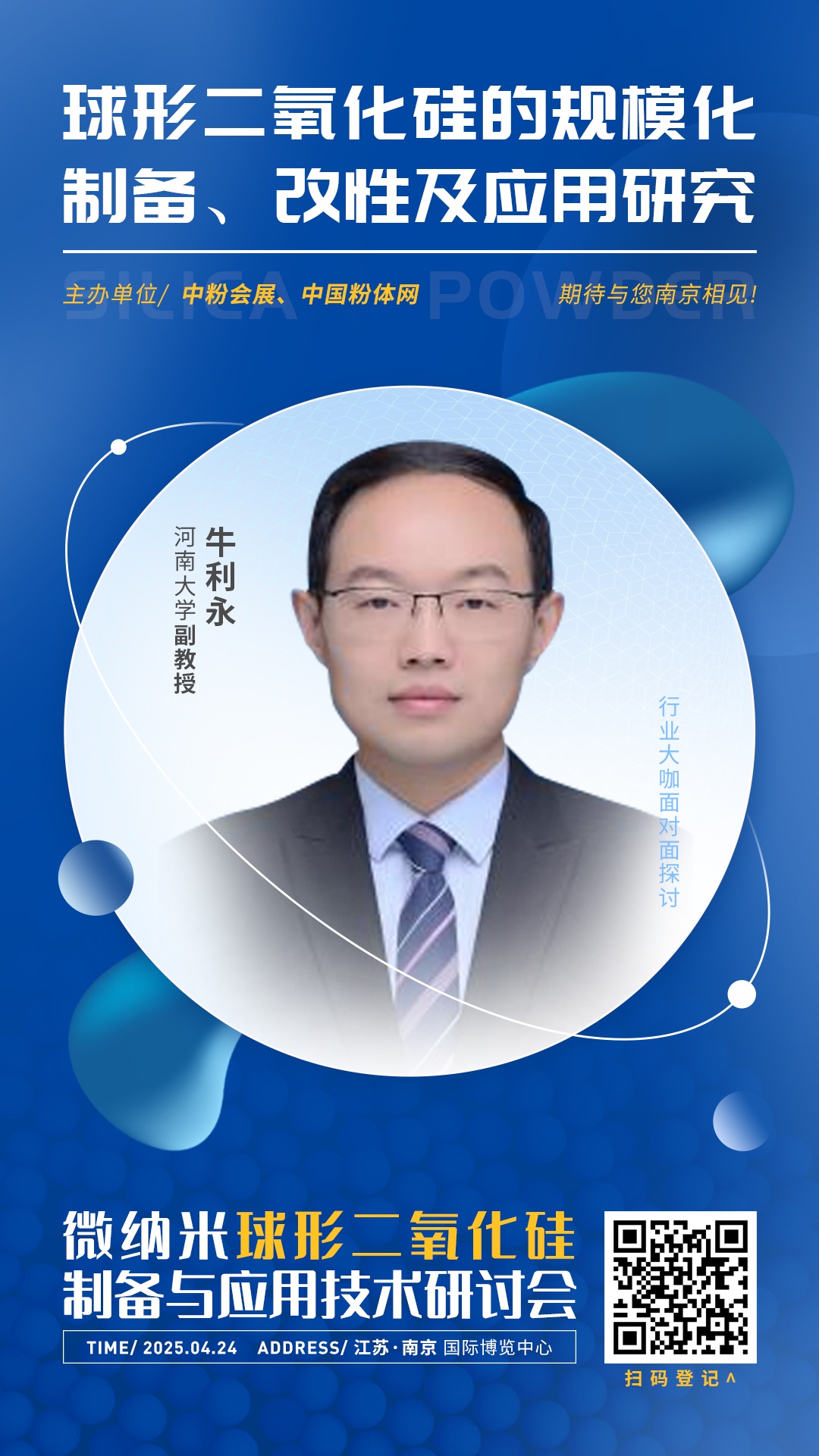 2025年4月23日,由中國粉體網、中粉會展主辦的“微納米球形二氧化硅制備與應用研討會”將在江蘇南京召開,屆時來自河南大學的牛利永副教授,將做題為《球形二氧化硅的規模化制備、改性及應用研究》的報告。