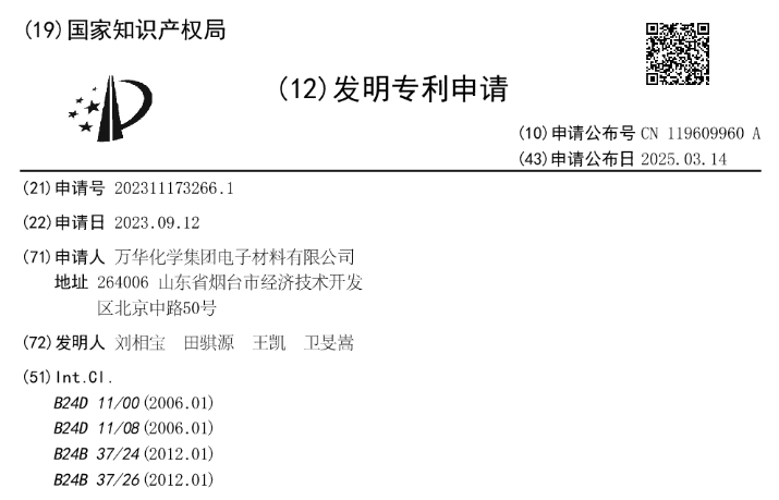 萬華化學取得一項名為“一種具有均勻直立泡孔的化學機械拋光墊、制備方法及其應用”的專利