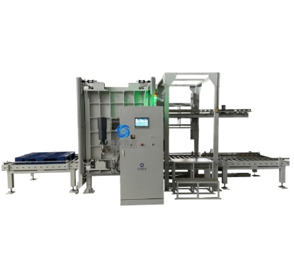1、該系統具有自動橫向豎向捆袋裝置、疊袋裝置、纏膜裝置、托盤回收裝置等;