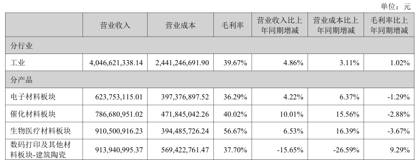 國瓷材料主要從事各類高端陶瓷材料及制品的研發(fā)、生產(chǎn)和銷售,已形成包括電子材料、催化材料、生物醫(yī)療材料、新能源材料、精密陶瓷、數(shù)碼打印及其他材料在內(nèi)的六大業(yè)務(wù)板塊,產(chǎn)品應(yīng)用涵蓋電子信息和通訊、汽車及工業(yè)催化、生物醫(yī)療、新能源汽車、半導(dǎo)體、建筑陶瓷等領(lǐng)域。