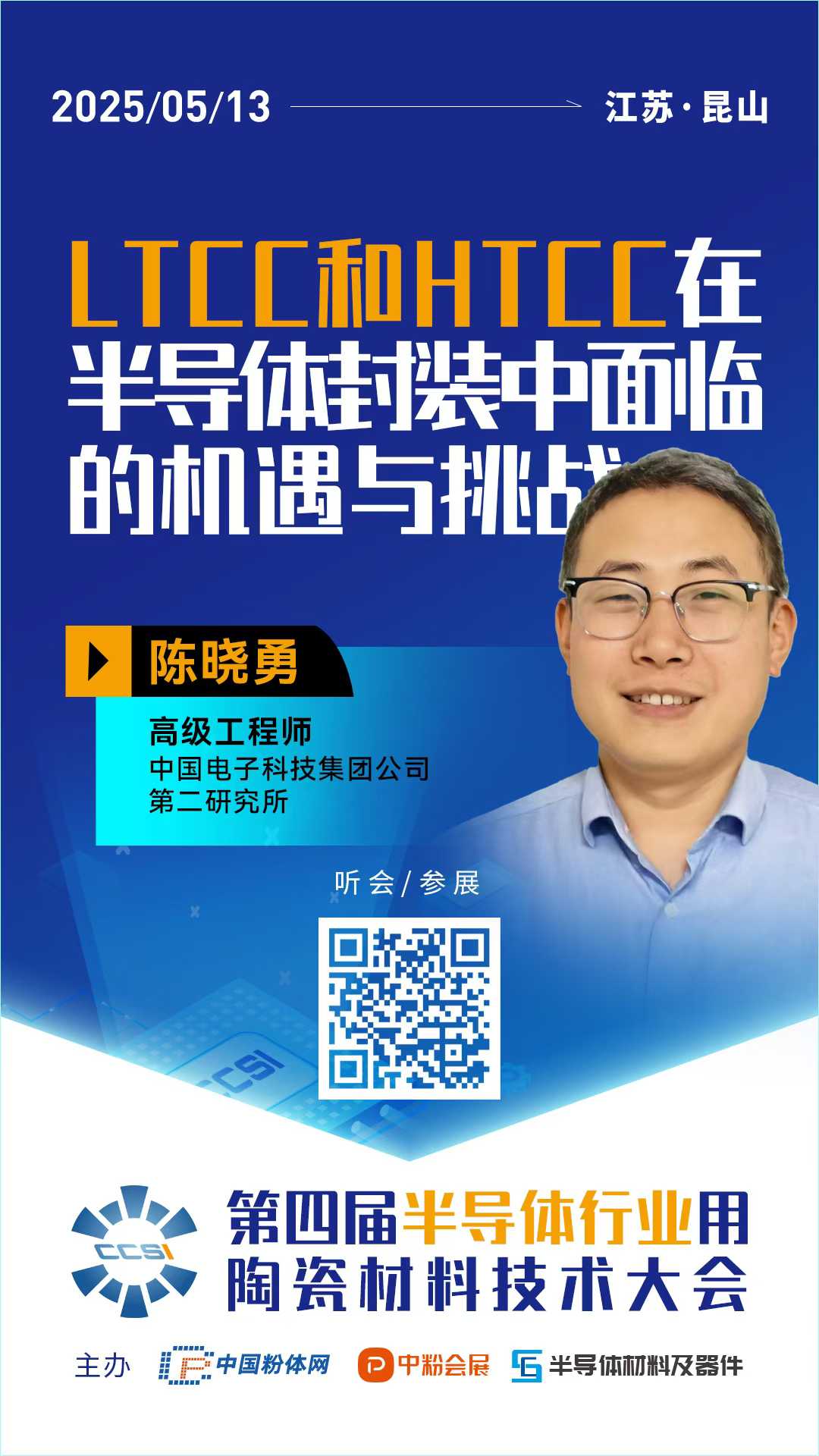 中國粉體網將于2025年5月13日在江蘇昆山舉辦“第四屆半導體行業用陶瓷材料技術大會”,屆時,來自中國電子科技集團公司第二研究所的高級工程師陳曉勇將帶來題為《LTCC和HTCC在半導體封裝中面臨的機遇與挑戰》的報告,報告將重點闡述其在LTCC工藝方面所取得科研成果,梳理了目前LTCC材料國產化進程,同時匯報在HTCC技術方面取得的進展情況。面對人工智能、大數據、5G/6G移動通信和新能源等需求牽引和先進封裝技術迭代帶來的市場沖擊,LTCC和HTCC將面臨巨大的機遇與挑戰,并展望未來LTCC/HTCC技術發展方向。