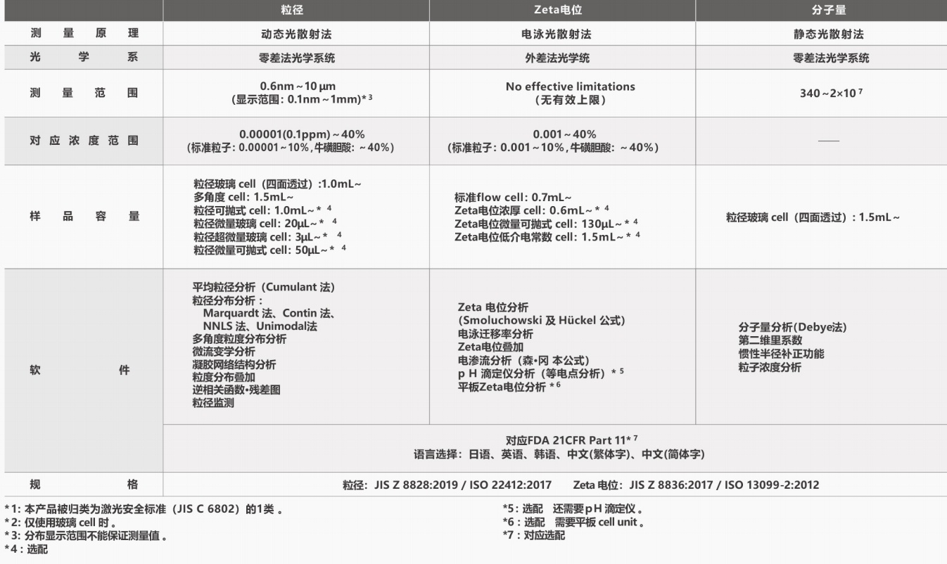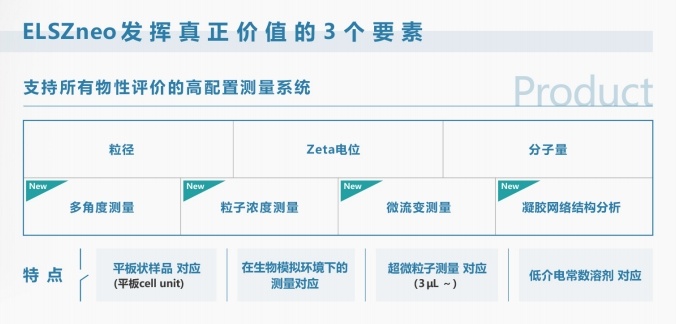 除可測量粒徑、Zeta電位和分子量外,還可進行粒子濃度、微流變學測量和凝膠網絡結構分析迄今為止難以進行樣品評價的希薄溶液、濃厚溶液、生物模擬環境下和超微量測量都可對應