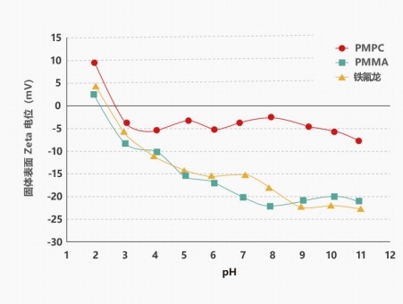 為了闡明生物材料與生物物質之間的相互作用,在生物模擬環境下測量板狀樣品的 Zeta 電位非常重要。下圖顯示了當鹽溶液的 pH 值發生變化時,測量各種樹脂表面 Zeta 電位的結果。