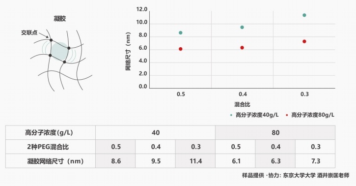 作為醫用材料備受關注的水凝膠具有三維網絡結構,評估其異質性很重要。下表顯示了通過測量用于合成不同濃度的 Tetra-PEG 凝膠的兩種 PEG 的混合比例來分析凝膠網絡的結果。