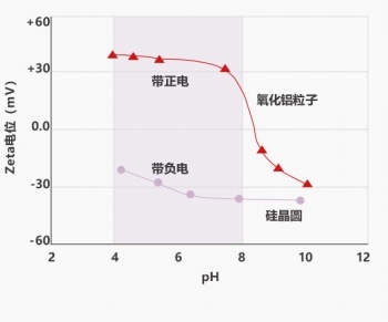 眾所周知,CM P工藝中使用的氧化鋁和二氧化硅等磨料粒子的分散狀態會根據溶劑的pH值而變化。右圖表示氧化鋁粒子的Zeta電位和硅晶片表面的Zeta電位的測量結果。