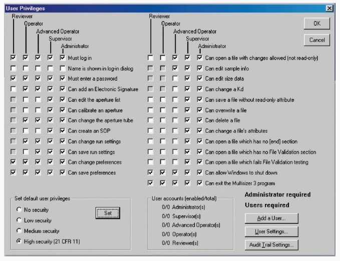 通過在 Multisizer 4e 軟件中選擇 21CFR第11部分,系統會自動地進行配置以符合這些規章。除了 21 CFR 第 11部分之外,該軟件還提供了其它的保密等級,你可以根據你個人的需要進行定制。