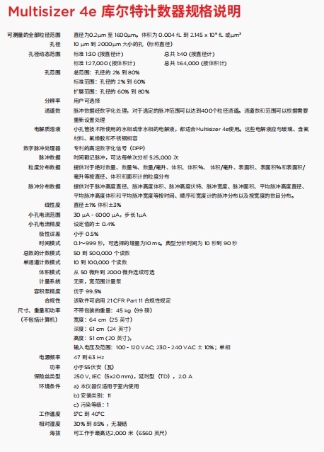 Multisizer 4e 為目前世界上通用和精確的粒度分析與顆粒及細胞計數分析儀。 通過使用庫爾特原理,亦稱電感應區法(Electrical Sensing Zone),Multisizer 4e 一次測量即可提供顆粒及細胞的絕對數量、體積和表面積為單位的高分辨率的粒度分布,粒度測量范圍自 0.2微米至 1600 微米。 Multisizer 4e 的分析結果不受顆粒顏色、形狀、成份或折射率的影響。