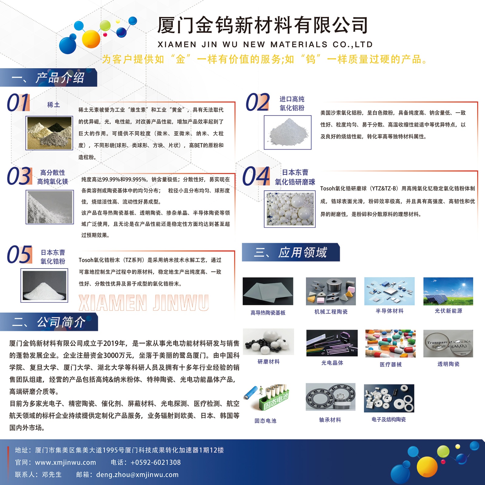 廈門金鎢新材料有限公司成立于2019年,是一家從事光電功能材料研發與銷售的蓬勃發展企業。企業注冊資金3000萬元,坐落于美麗的鷺島廈門。由中國科學院、復旦大學、廈門大學、湖北大學等科研人員及擁有十多年行業經驗的銷售團隊組建,經營的產品包括高純&納米粉體、特種陶瓷、光電功能晶體產品等。