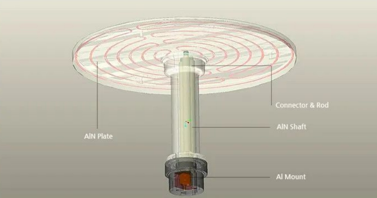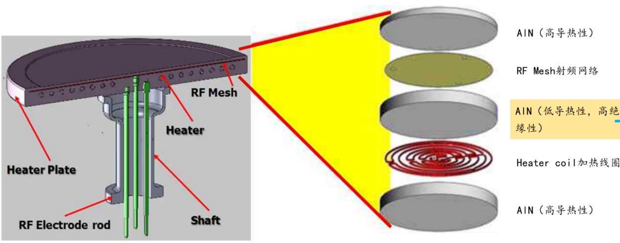 加熱器的支持體一般采用與基座熱膨脹系數相近的陶瓷材料。加熱器采用軸(Shaft)接合底部的獨特結構,能保護端子和導線不受等離子體以及腐蝕性化學氣體的影響。支持體內設有熱傳導氣體進出管道,保證加熱器溫度均勻;c支持體之間用接合層進行化學接合。