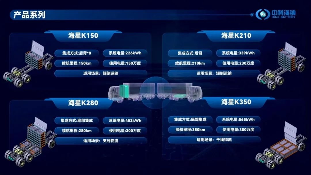 針對不同場景的差異化需求,“中科海鈉·海星”鈉離子電池商用車解決方案提供“海星K150”、“海星K210”、“海星K280”和“海星K350”四款產品型號,前兩款產品專為短倒運輸場景設計,后兩款產品則精準定位于物流運輸領域的技術需求。