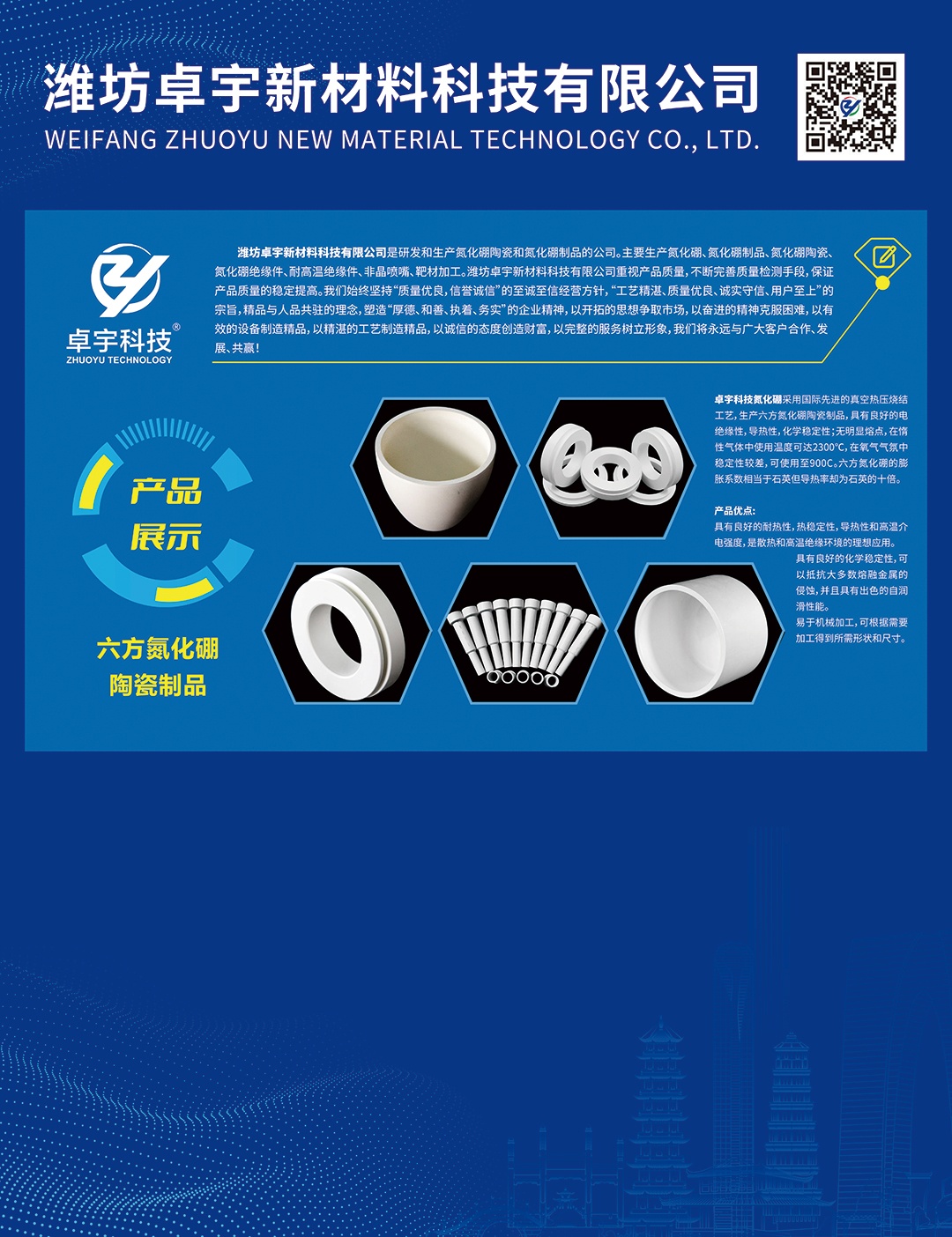 濰坊卓宇新材料科技有限公司是研發和生產氮化硼陶瓷和氮化硼制品的高新技術企業,公司主要生產氮化硼、氮化硼制品、氮化硼陶瓷、氮化硼絕緣件、耐高溫絕緣件、非晶噴嘴、靶材加工。