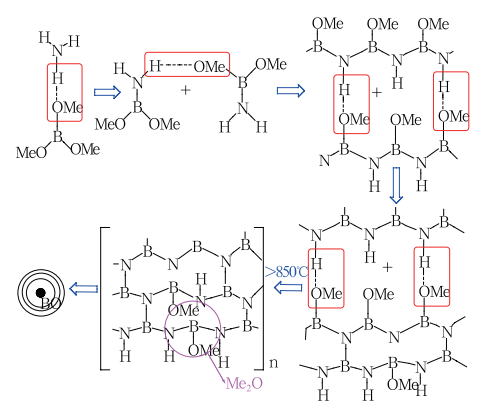 殘余雜質氧理論認為球形形貌的形成主要依賴于Me2O基團消除時殘余雜質氧的產生。BN的形成機理為:B(OMe)3+NH3→BN+3MeOH。具體的化學形成機制如下圖。