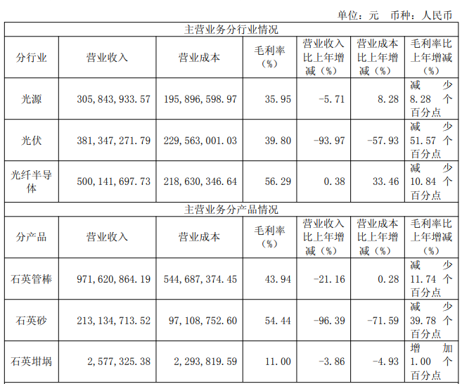 石英股份2024年年度業績報告顯示,公司營業收入約12.1億元,同比減少83.15%;歸屬于上市公司股東的凈利潤約3.34億元,同比減少93.38%;基本每股收益0.62元,同比減少93.33%。