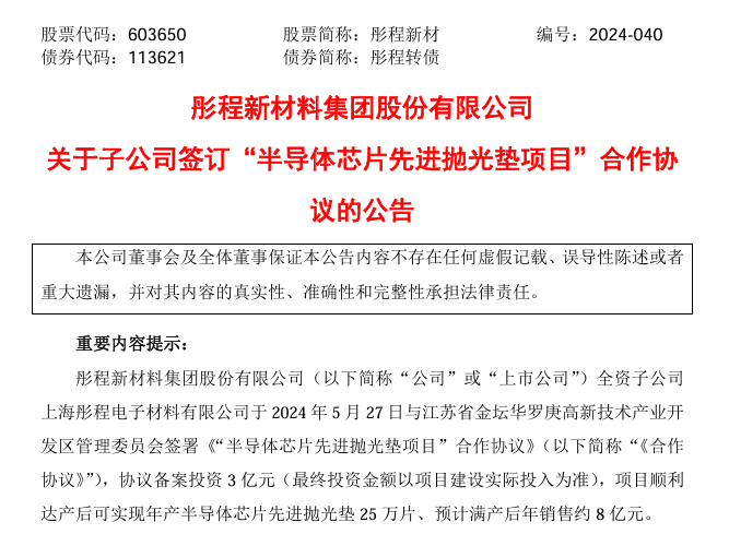 此外,公司全資子公司彤程電子于2024年5月27日與江蘇省金壇華羅庚高新技術產業開發區管理委員會簽署《“半導體芯片先進拋光墊項目”合作協議》,在江蘇省金壇華羅庚高新技術產業開發區內投資建設半導體芯片拋光墊生產基地,協議備案投資3億元(最終投資金額以項目建設實際投入為準),主要從事半導體芯片拋光墊的研發、生產和銷售,項目順利達產后可實現年產半導體芯片先進拋光墊25萬片、預計滿產后年銷售約8億元。