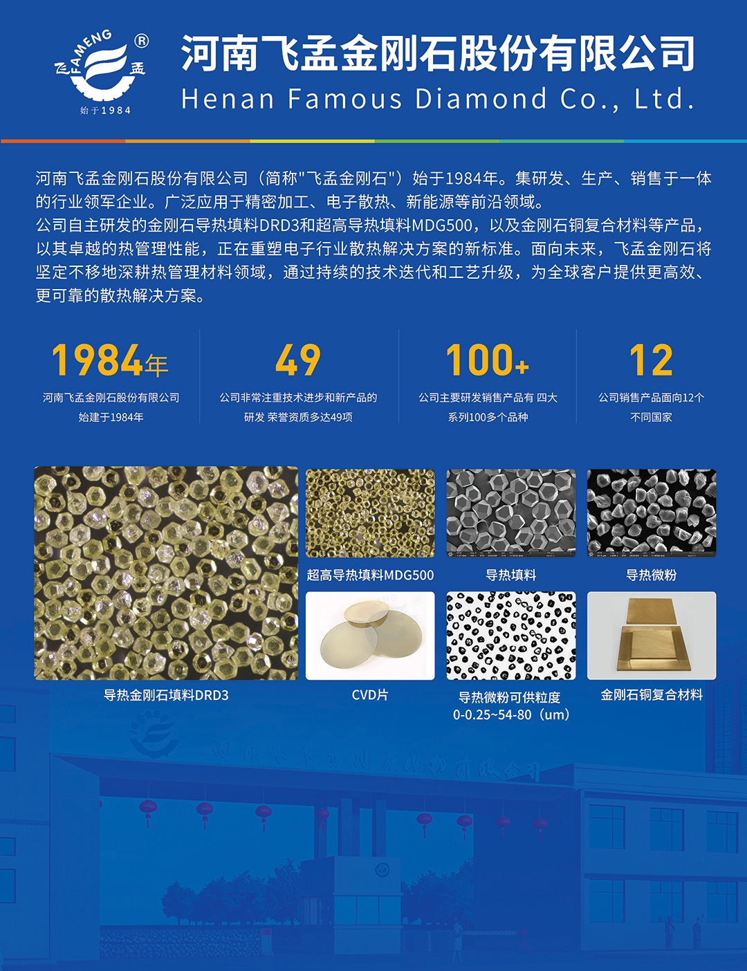 河南飛孟金剛石股份有限公司(以下簡稱“公司”)是由河南飛孟金剛石工業有限公司改制而來, 始建于1984年,注冊于1998年,屬外商投資未上市股份制企業,是集研發、生產、服務三位于一體 的超硬材料及制品的廠家。主要產品多晶樹脂金剛石磨料、立方氮化硼磨料、超硬材料微粉及CVD 金剛石厚膜等4大系列100多個品種。 公司采用技術工藝、精密檢測儀器及嚴格的質量管理,已順利通過ISO9001、ISO14001和ISO45001 國際認證。 公司在高速穩步發展的同時,非常注重技術進步和新產品的研發,擁有河南省博士后創新實踐基地、 河南省院士工作站和河南省科技創新團隊和近百種自主知識產權;多年來公司承擔火炬計劃項目、 國家重點新產品項目等,并與北京科技大學、河南工業大學、河南理工大學建立了長期的合作關系。 “細粒度含硼金剛石”和“亮黑色高強度立方氮化硼”產品已被認定為國家高新技術產品,公司被 河南省科技廳授予高新技術企業、河南省超硬研磨材料工程技術研究中心。產品已出口到美國、日 本、德國、韓國等地。