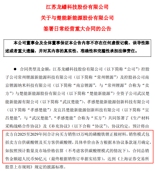 中國粉體網訊 5月9日,龍蟠科技公告稱,公司控股子公司常州鋰源及控股孫公司南京鋰源與楚能新能源全資子公司武漢楚能、孝感楚能及宜昌楚能共同簽署《生產材料采購戰略合作協議》及《補充協議》,預計自2025至2029年間常州鋰源及南京鋰源合計向買方銷售15萬噸磷酸鐵鋰正極材料,總銷售金額預計超50億元,協議有效期至2030年4月30日。