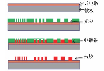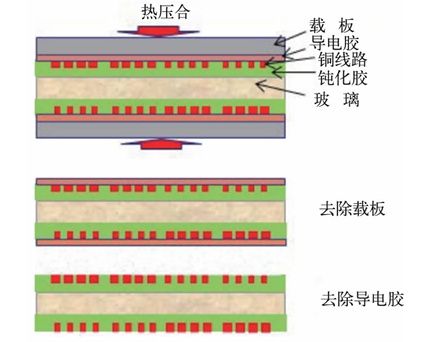 劉富漢等開發(fā)了CTT和PTE技術(shù)。CTT主要包括精細重布線層(RDL)線預制和將RDL集成到基板上兩個過程。每一RDL可以在可移動載體上單獨制造一層薄導電層,并在轉(zhuǎn)移到基板上之前測試或檢查細線成品率,精細線路的形成采用細線光刻和電解鍍銅的方法,并且以薄銅箔作為鍍層的種子層。