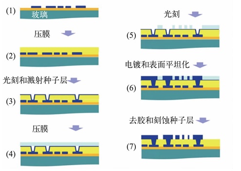 喬治亞理工學院的Lu等研究了多層RDL的2.5D玻璃轉(zhuǎn)接板技術(shù),實現(xiàn)了面板級光刻后1.5~5μm的線條溝槽制備,并提出改進式半加成工藝法(SAP),達到了5μm以下低成本的線寬制作工藝。工藝流程為在第一層RDL的基礎(chǔ)上進行壓膜,然后通過顯影制作通孔并暴露出第一層RDL的銅焊盤,接著進行種子層濺射。濺射完成后,將高分辨率的光刻薄膜層壓在基板上側(cè)并進行高精度的曝光、顯影。完成上述步驟后,采用電鍍工藝填充通孔并用旋轉(zhuǎn)金剛刀進行表面平坦化,最后去除光刻薄膜并完成種子層刻蝕。
