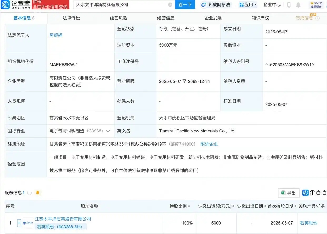 近日,天水太平洋新材料有限公司成立,注冊資本5000萬元,經營范圍包含:電子專用材料制造;電子專用材料銷售;電子專用材料研發等。企查查股權穿透顯示,該公司由石英股份全資持股。 此前,天水太平洋石英材料產業園項目簽約儀式在甘肅天水麥積區舉行,項目一期總投資約6億元,主要生產高純石英制品等產品。