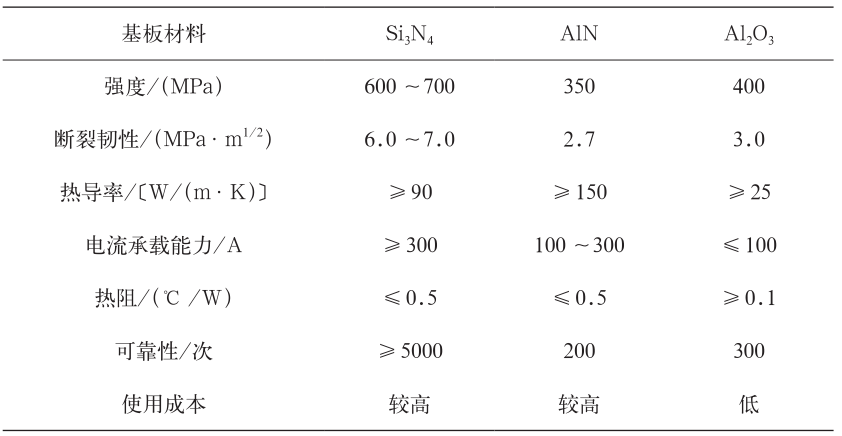 Si3N4陶瓷是綜合性能最好的陶瓷基板材料,熱導(dǎo)率可達(dá)90~120W/(m·k),熱膨脹系數(shù)為3.2×10-6/℃,并具有優(yōu)異的機(jī)械強(qiáng)度、良好的化學(xué)穩(wěn)定性和抗熱沖擊性。盡管Si3N4陶瓷基板具有略低于AlN的導(dǎo)熱性,但其抗彎強(qiáng)度、斷裂韌性都可達(dá)到AlN的2倍以上,同時,Si3N4陶瓷基板的熱膨脹系數(shù)與第3代半導(dǎo)體襯底SiC晶體接近,使其能夠與SiC晶體材料匹配性更穩(wěn)定。