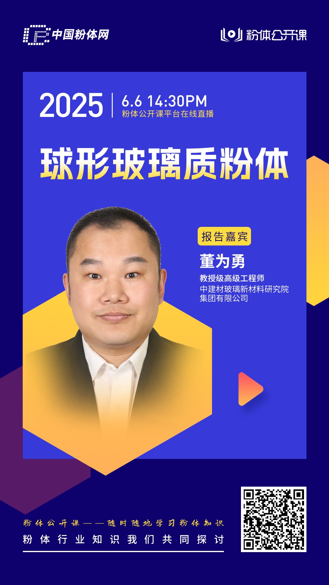 粉體公開課特邀中建材玻璃新材料研究院集團有限公司董為勇教授級高級工程師給我們帶來一場關于球形玻璃質粉體的專屬直播,一同深入探索這個充滿奧秘與潛力的微觀世界。