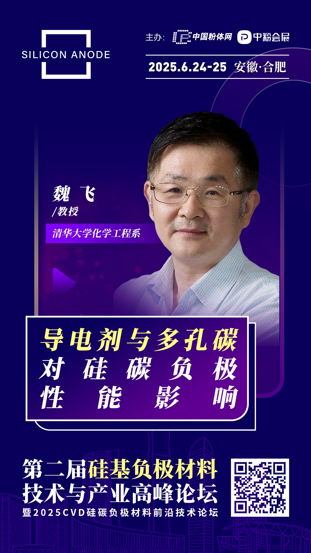 針對各類負極材料的產業化技術與國內外市場狀況,中國粉體網將于2025年6月24-25日在安徽·合肥舉辦第二屆硅基負極材料技術與產業高峰論壇暨2025CVD硅碳負極材料前沿技術論壇。旨在為負極材料產業鏈上中下游企業搭建深度交流的平臺,開展產、學、研合作,助推負極材料行業持續健康發展。屆時,清華大學魏飛教授將作題為《導電劑與多孔碳對硅碳負極性能影響》的報告。