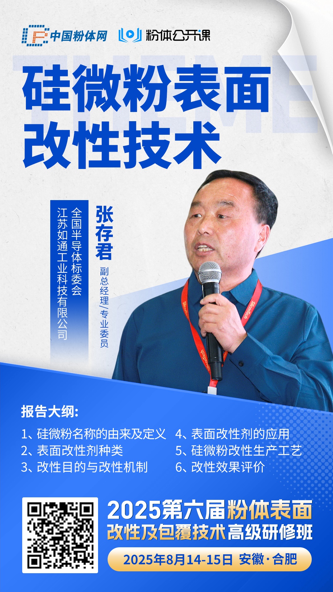 中國粉體網(wǎng)訊 為推動粉體表面改性及包覆技術(shù)發(fā)展,促進(jìn)產(chǎn)學(xué)研交流合作,中國粉體網(wǎng)粉體公開課將于 2025 年 8 月 14 - 15 日舉辦 “2025 第六屆粉體表面改性及包覆技術(shù)高級研修班”。本次研修班特邀江蘇如通工業(yè)科技張存君副總主講《硅微粉表面改性技術(shù)》課程,為參會人員系統(tǒng)講解硅微粉表面改性。