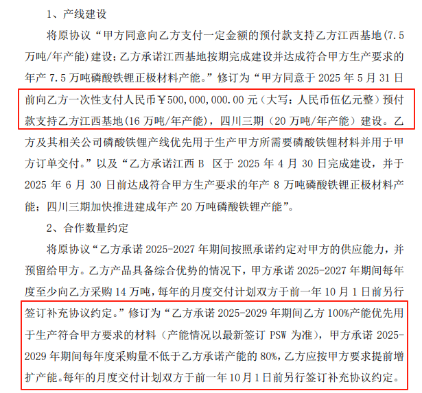 在產線建設方面,按照此前約定,寧德時代將支付一定金額預付款支持江西升華江西年產7.5萬噸磷酸鐵鋰正極材料基地建設。而在最新的協議中,前述條款變更為寧德時代向江西升華一次性支付5億元預付款,用于后者江西年產16萬噸基地、四川三期年產20萬噸磷酸鐵鋰生產基地建設;江西升華承諾將在2025年6月30日達成江西年產8萬噸磷酸鐵鋰產能,并加快推進四川三期產能建設。
