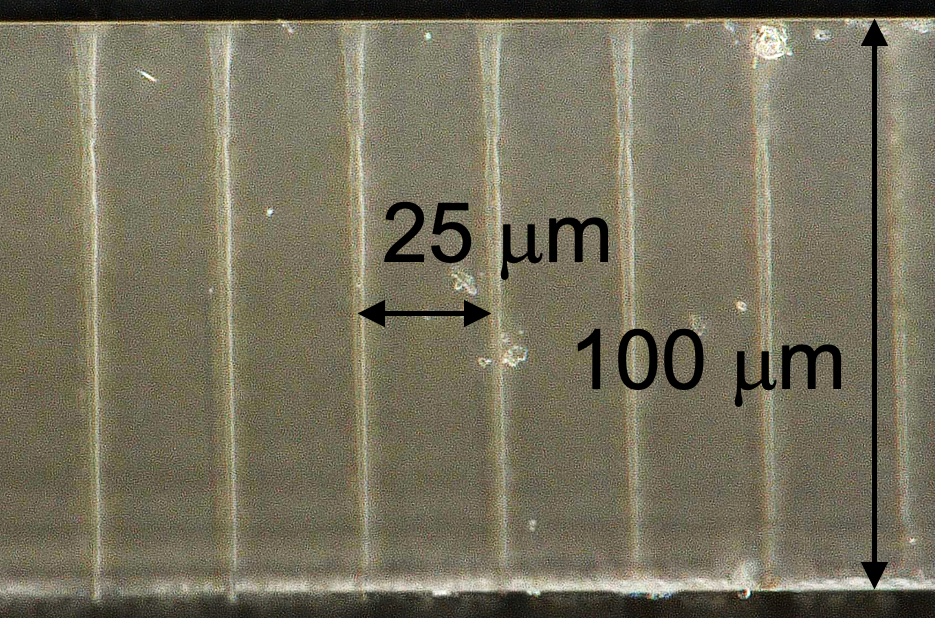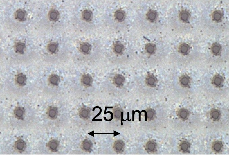 上方和側面觀察EN-A1玻璃上鉆孔的微孔顯微圖像 來源:Toshio Otsu.High-aspect-ratio, 6-μm-diameter through-glass-via fabrication into 100-μm thick EN-A1 by dry laser micro-drilling process