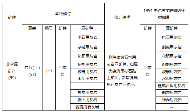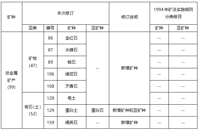 晶質石墨、隱晶質石墨成為石墨的亞礦種,碎云母為云母的亞礦種,鉀硝石為硝石的亞礦種,蛋白石為蛋白土的亞礦種,耐火用橄欖巖為橄欖巖的亞礦種,拉絲用玄武巖為玄武巖的亞礦種,壓裂用砂為天然石英砂的亞礦種,玻璃纖維用砂巖為砂巖的亞礦種,鈣粉用大理巖為大理巖的亞礦種,脫硫用石灰巖為石灰巖的亞礦種。