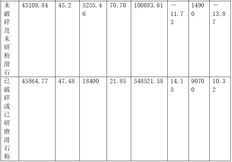2024年我國未破碎及未研粉的滑石出口量100683.61噸(2023年出口量114067.28噸),金額1.49億元;2025年1~4月出口量40887.17噸(2024年出口量22278.81噸),金額7574.02萬元。