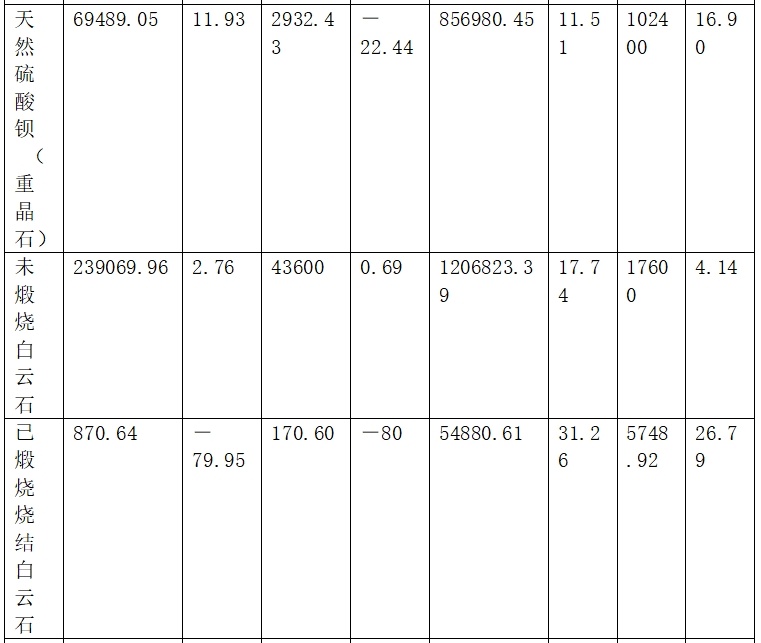 2024年我國未煅燒白云石出口量1206823.39噸(2023年出口量1024950.21噸),金額1.76億元;2025年1~4月出口量438617.53噸(2024年1~4月出口量387406825千克)金額5394.82萬元。