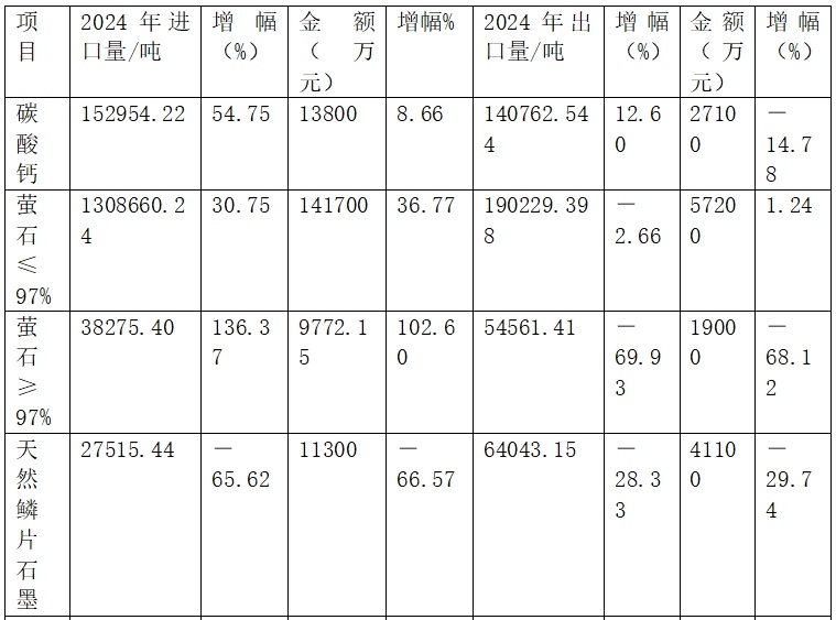 2024年螢石按重量計氟化鈣含量≤97%)出口量190229.398噸(2023年出口量195434.216噸),金額5.72億元;2025年1~4月出口量59875.365噸(2024年1~4月出口量60243.66噸),金額1.87億元。